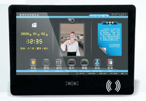 八大核心功能:錄臉、充值、查詢、密碼、掛失、解掛、發(fā)布通知、廣告。